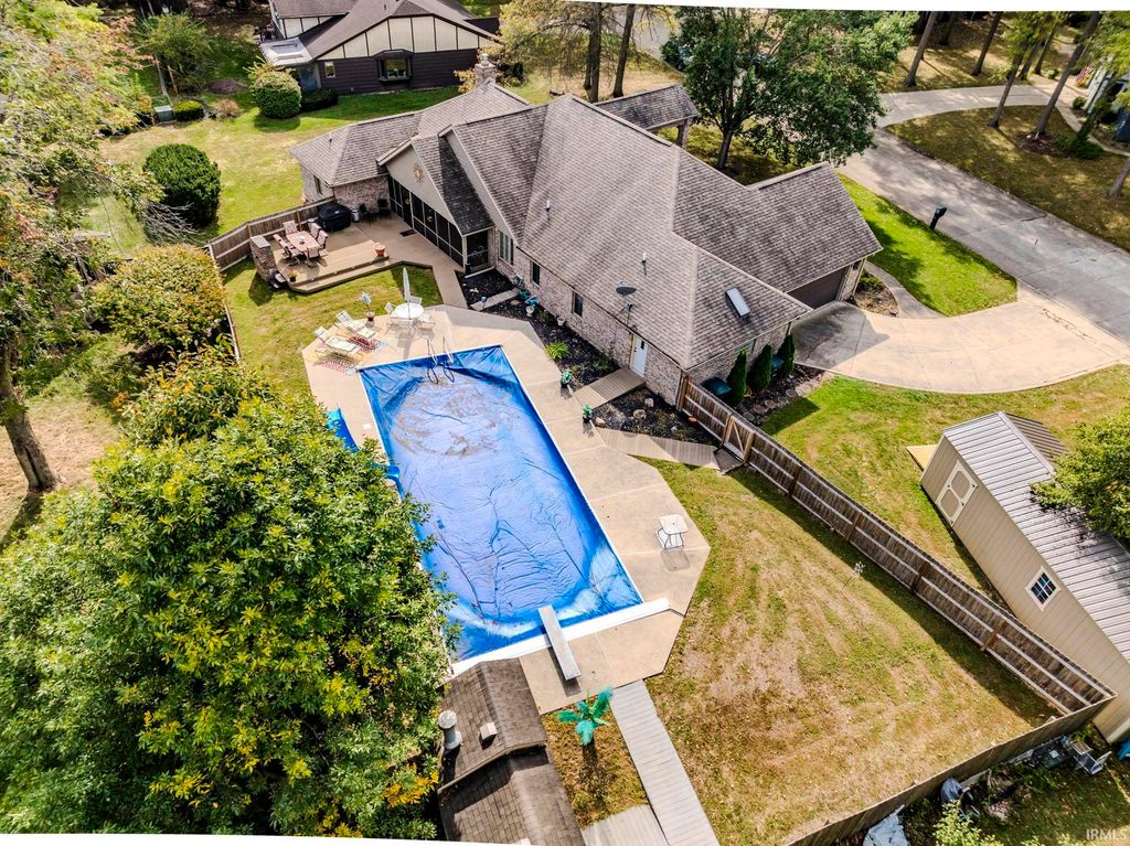 This stunning all-brick home offers 4 spacious bedrooms and 3.5 baths, perfect for comfortable family living. Gleaming hickory floors flow seamlessly throughout, adding warmth and elegance to every room. The inviting den, currently used as a home office, provides a quiet retreat for work or study. The expansive living room right off the kitchen and dining room offers great space for relaxation and a great space for gatherings. The coffee bar and breakfast area is a cozy corner for time to look out into the backyard and enjoy the beauty of the pool and landscaping. The screened in patio area is a great gathering space for entertaining or relaxing with a good book. The pantry area gives the cook in your life a wonderful area to work and store the items you need for the perfect meals.Kitchen has double ovens stainless steel appliances and plenty of counter space to work. The laundry room was moved to the garage and new flooring raised to make it a smoother transition for handling laundry. The outdoor fireplace is great for cozy nights under the stars. Charming gingerbread detailing adds character and a touch of classic craftsmanship, making this home with beautiful and unique.The bathrooms have been completely re tiled showers with new floors. This home is a must see. Very well maintained and ready for you to move in and start entertaining. Crawl is encapsulated and HVAC has commercial grade dehumidifier. Stunning chandeliers in the primary bath and dining room. lots of attention to detail in this home.