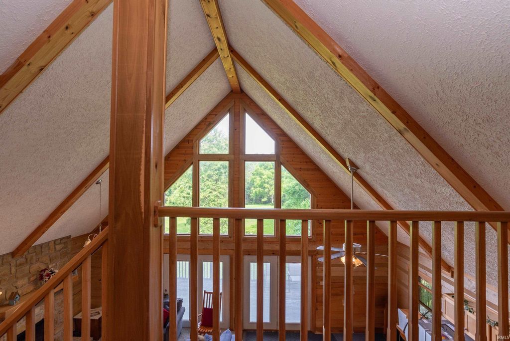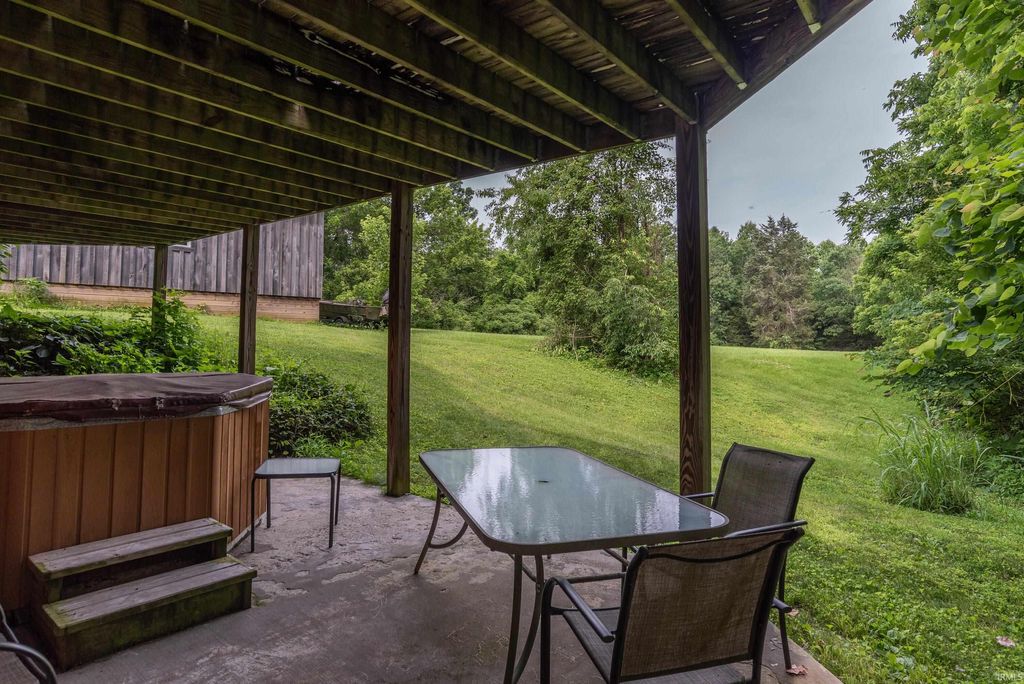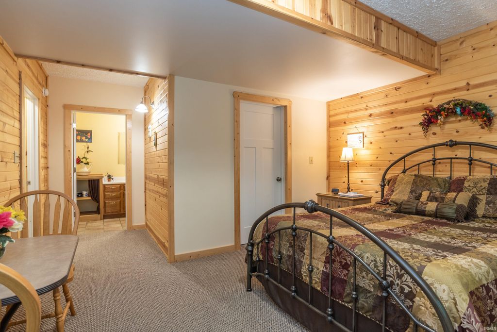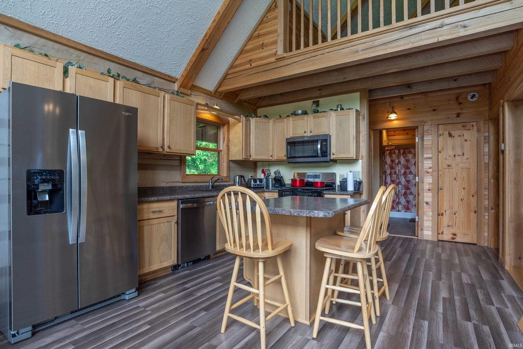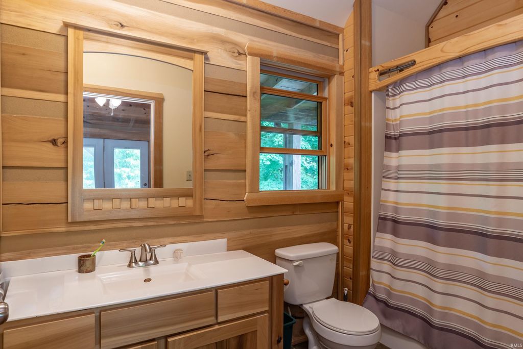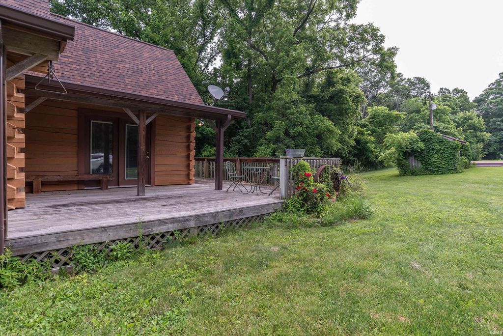 Surrounded by Yellowwood and Morgan/Monroe State Forests, this beautifully crafted all suite, four-bedroom, four-bathroom cabin offers natural charm with modern touches. 10 gorgeous acres of protected forest is the setting for this custom designed cabin, handcrafted from solid poplar logs (this is a NOT a kit home). The spacious main living area features soaring vaulted ceiling and a cozy stone clad gas fireplace. An expansive wall of windows bathes the space in natural light. An easy flowing open floor plan connects the living room to a fully equipped kitchen with plenty of cabinets, a central island, a pantry and space for a dining table. A large loft above overlooks the main level and provides an extra room for relaxation, a home office, or a family room/game area. There is a huge drywalled walk-in storage room upstairs as well. There are two bedroom ensuites with bathrooms located on the main level and each has access to outdoor deck space to enjoy your morning coffee or an evening sunset. The fully finished walkout basement includes two guest quarter bedrooms with ensuite baths and their own private entrances. Additionally, one has a sitting room adjacent to it. This space is perfect for family, visitors or potential rental income. They are currently income producing and are frequently rented by the day or week. Outside, the deck wraps completely around the cabin and the lower level has a patio area and a separate deck. An extra large detached garage offers ample space for vehicles, tools and outdoor gear. Whether you're looking for a full-time residence, a weekend getaway, or a potential investment property, this stunning log cabin delivers that cozy cabin charm you've been seeking, conveniently located in the sweet spot between Bloomington and Nashville!!! The hot tub and some interior furnishings may be negotiable. The adjacent 4 BR vacation rental cabin at 1291 N Sewell Road is also available for sale, MLS #202605654