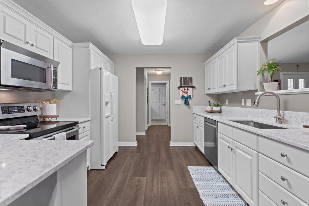 Beautifully updated home featuring fresh professional interior paint (2020), new plank flooring (2022-2023), and new carpet in the guest room and primary closet. Enjoy multiple living spaces including a four-season sunroom, covered patio and a welcoming front porch. The split floor plan offers privacy with the primary suite on one side and guest bedroom and bath on the other. Both bathrooms have been updated (2020 & 2023), and the kitchen features new quartz countertops and a new dishwasher (2025). Major mechanical updates include a new A/C and water heater (2023). Additional highlights include a large walk-in pantry, custom blinds, a well-appointed laundry room, and an extra-wide heated garage with cabinets, workbench, utility sink, and walk-up attic. Mature landscaping with beautiful perennial plantings completes the package.