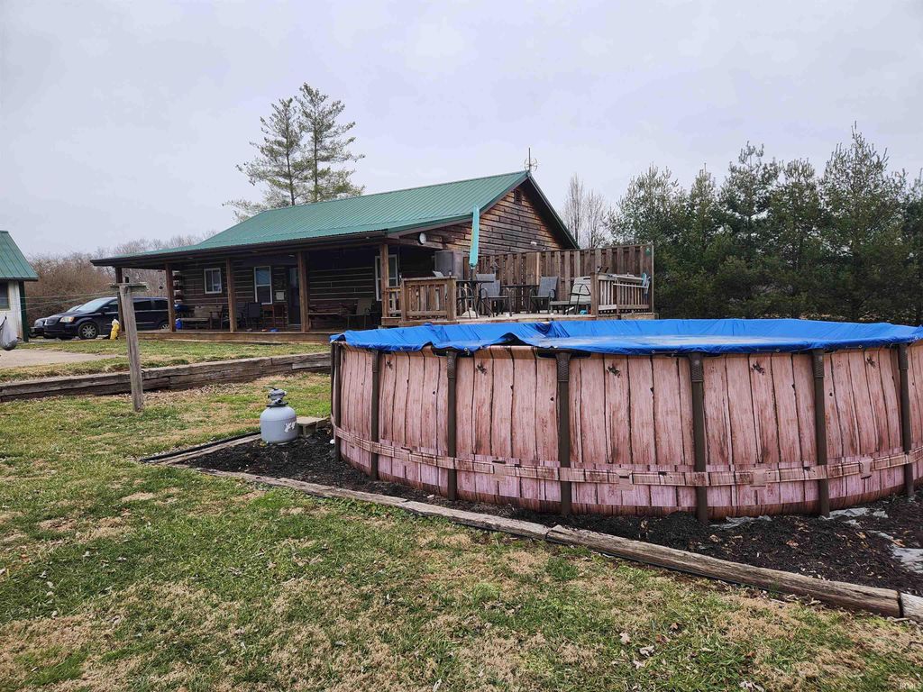 We know that you have been looking and waiting for this listing to appear. Here it is!!! It is time to enjoy log home living with a fresh modern interior of finished logs and box car ceilings. The fully furnished kitchen with stove, refrigerator, dishwasher, and microwave are waiting for your recipes. The eat-in kitchen and open plan design make entertaining a pleasure. The two-bedroom, two full bath set up provides additional privacy while accommodating guests. The spacious utility room and pantry open onto a full-length back porch for those evenings watching the sun set in the west. Off the back porch is a deck leading to a 22 ft circular swimming pool and also a 24 ft x 24 ft concrete basketball court ready to use. The spacious back yard is more than sufficient for those tag football games and family outings. The two-car heated garage could use a little TLC but is a welcome refuge for the husband who enjoys projects away from the house. All of this is located just south of the Patoka River and north of the Crawford County line on Hwy 37. Convenient to town and just far enough into the country to give peach and quiet. Offered at $235,000. Can we make you an appointment?