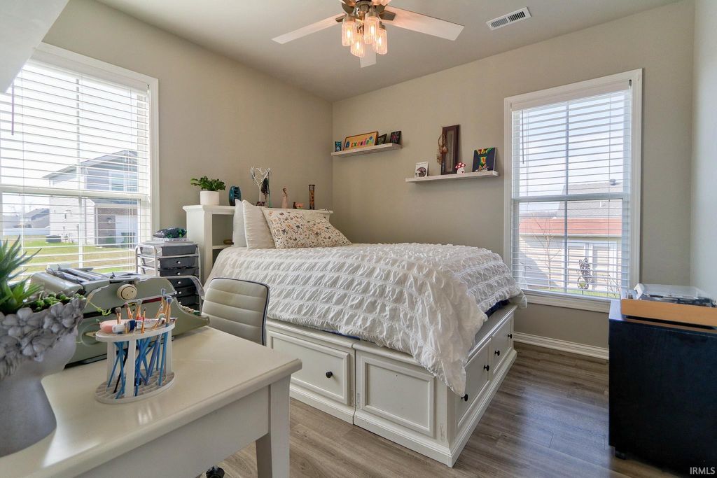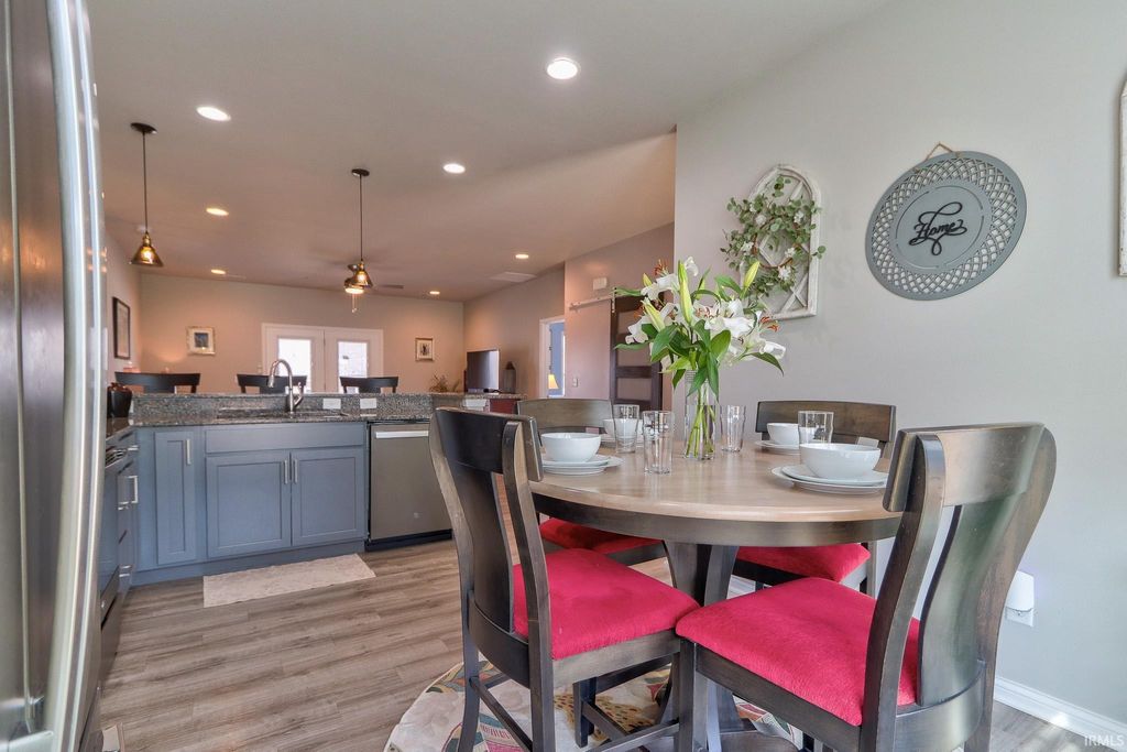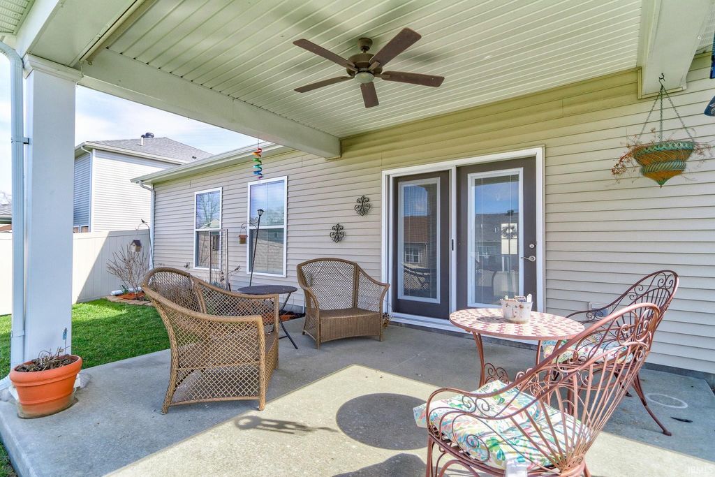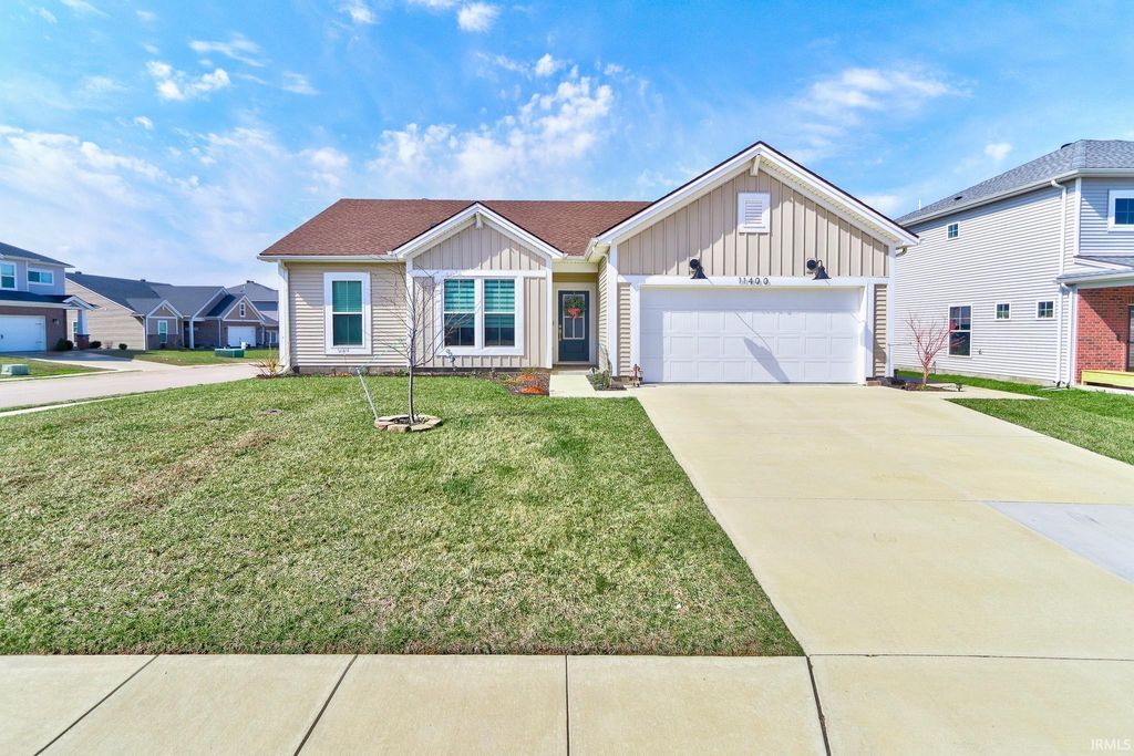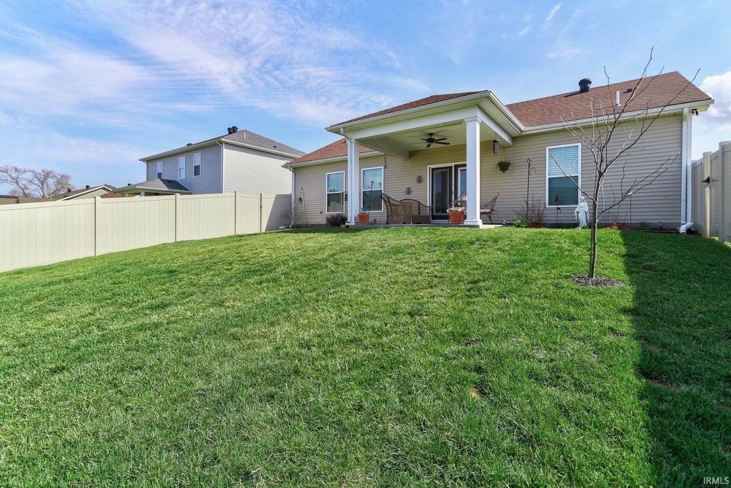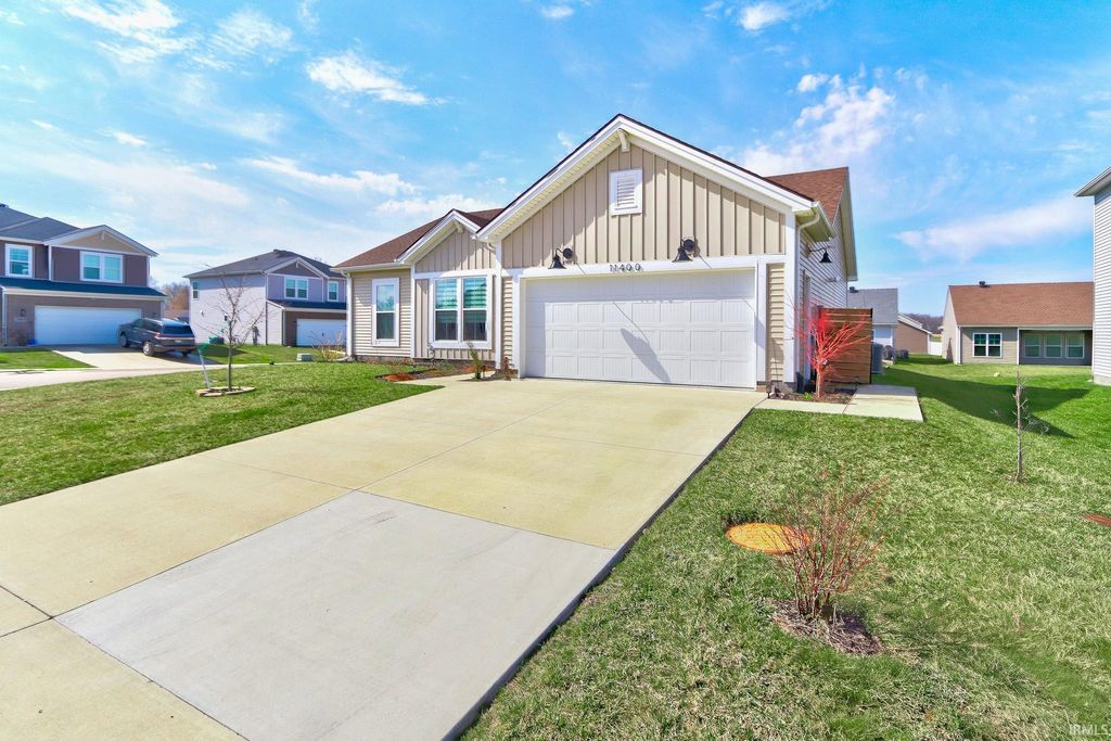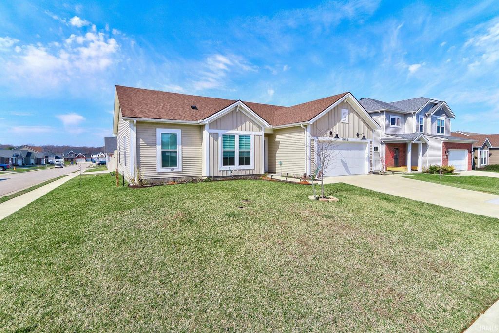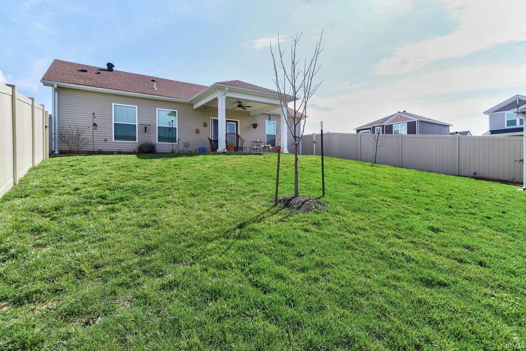 This move-in ready 3 bedroom, 2 bath one-story contemporary home offers a bright, airy feel and an easy-flowing layout located in the desirable McCutchanville area just off Boonville-New Harmony Rd. Enter through the foyer into the open living, dining, and kitchen space filled with natural light and finished with LVP flooring throughout. The eat-in kitchen features stainless steel appliances, stone countertops, a breakfast bar with seating, and a pantry conveniently located in the laundry room just off the foyer. A split bedroom floor plan provides added privacy, with the primary suite offering a large walk-in closet and an ensuite bath with a twin sink vanity and tiled glass walk-in shower. Two additional bedrooms are bright and comfortable and share the second full bathroom. The laundry room adds functionality and extra storage, along with attic storage above. Outside, enjoy a covered patio overlooking the fenced backyard with landscaping and a storage shed, all situated on a corner lot. The attached 2-car garage was extended by the builder, and the furnace was relocated to allow for the added pantry space.