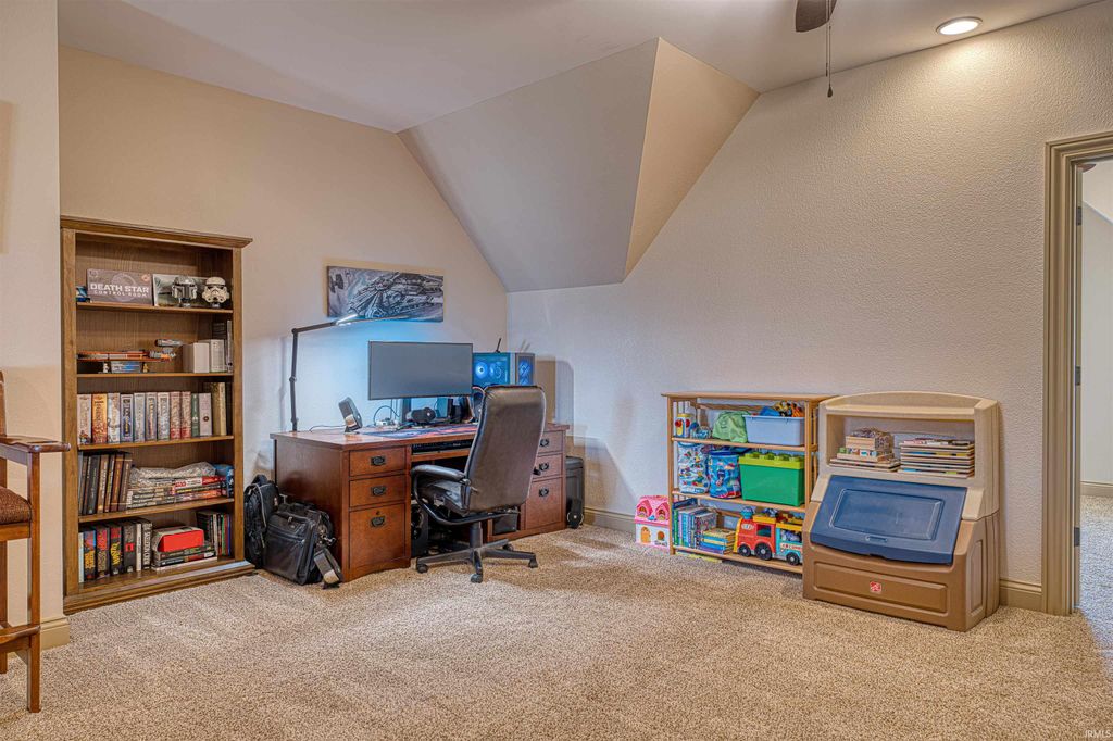 18939 Amherst Lane, is a meticulously maintained four-bedroom home located in the prestigious Cambridge Village Community on Evansville's north side. A true testament to top quality construction and craftsmanship, this home was custom-built by CAC Custom Homes in 2014 and tops out at 3,367 square feet of living space. The open-concept layout allows for comfortable living at its finest. Notable features of the expansive great room include a stunning vaulted ceiling and a gorgeous stone fireplace complete with built-in cabinets and shelving. The oversized window-wall provides an abundance of natural light as well as views of the backyard oasis, complete with a lovely covered patio overlooking the pristine 18' x 36' heated, salt water swimming pool! Summer days and evenings will surely be enjoyed in this amazing outdoor haven. The chef's kitchen is indeed the heart of the home, affording an abundance of space to prepare and enjoy meals and entertain guests. The primary bedroom and gorgeous en-suite provide the ideal ambiance for relaxation and privacy. Two additional bedrooms, a full bathroom, den, mudroom and laundry room round out the main floor living space. Upstairs you will find an expansive bonus room offering additional flex-use space, along with a fourth bedroom and a half-bathroom. Adjacent attic storage is easily accessible via the bonus room. The oversized 2.5-car side-load garage boasts additional storage space and the garage floor is epoxy-coated. This beautiful one-owner home has undoubtedly been well-maintained and is in immaculate condition! Common amenities available to residents of Cambridge include use of activity center, fitness room, outdoor community pool, playground, tennis/pickleball court, and basketball court. The renowned community golf course and clubhouse restaurant (both open to the public) are perfect modern conveniences. You must see to appreciate the lovely Cambridge community and this amazing home!