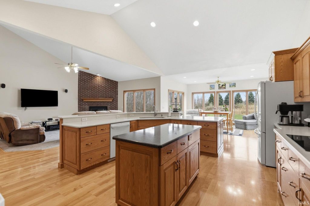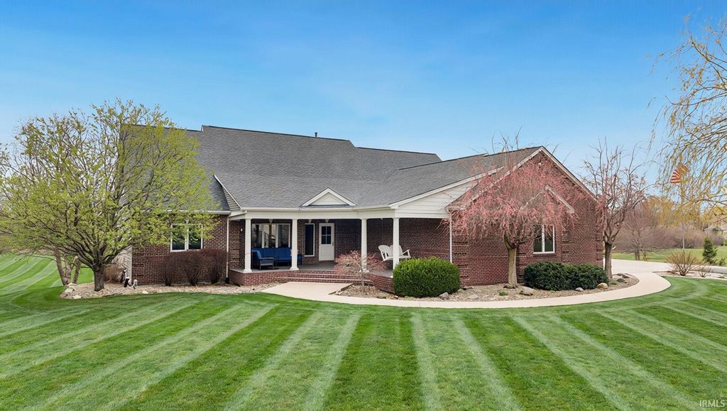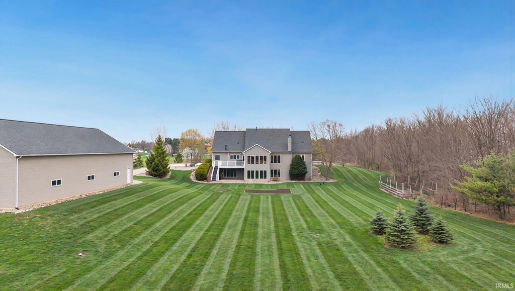 A Rare Opportunity. Custom-Built Ranch with City Water, City Sewer, and No HOA on 10.15 private acres yet minutes from Dupont/I-69. A stocked 1-acre pond, 70x35 outbuilding, and irrigated garden create an exceptional lifestyle and abundance of nature! Inside, a thoughtfully designed open layout is anchored by a 17x16 chef's kitchen with oversized gathering bar, abundant prep space, and walk-in pantry. The main level features 3 bedrooms including a large primary suite. The walk-out lower level is built for entertaining with a full bar, plus expansive living space, 4th bedroom, and two additional rooms ideal for crafts, hobbies, or a home gym. Enjoy morning coffee or evening sunsets from the covered porch overlooking the pond. Upper loft offers flexibility for office or guests. Additional features include unfinished space under porch for wine cellar or storm shelter, and oversized garage with pet wash, heater, and walk-up attic. Conveniently located Minutes from Hospitals & Dupont/I-69 area.