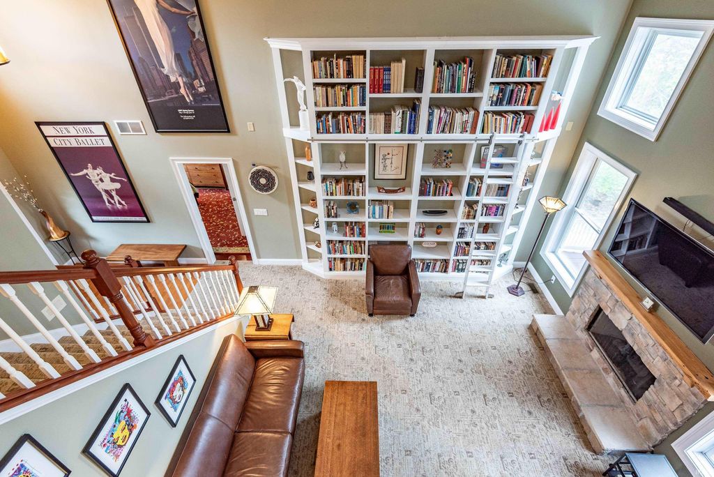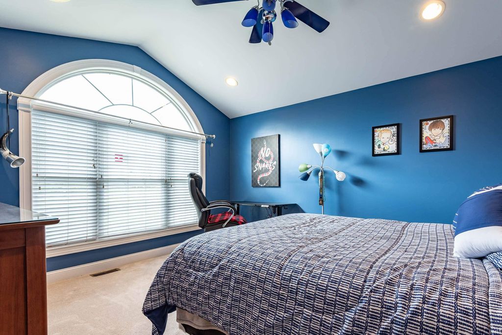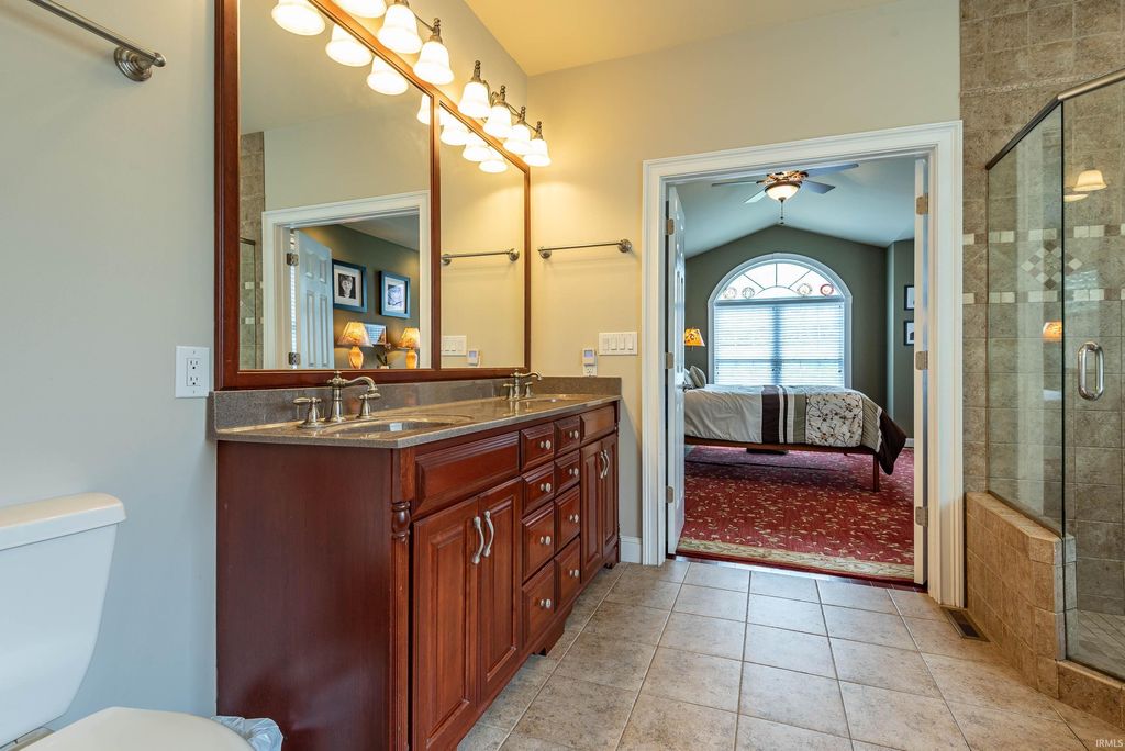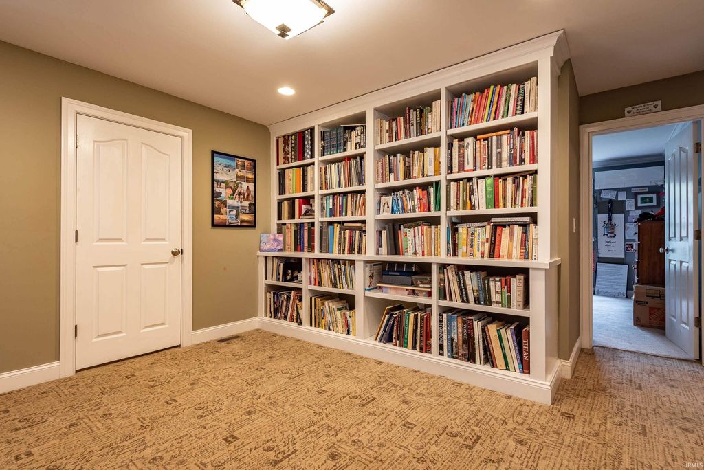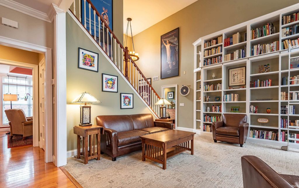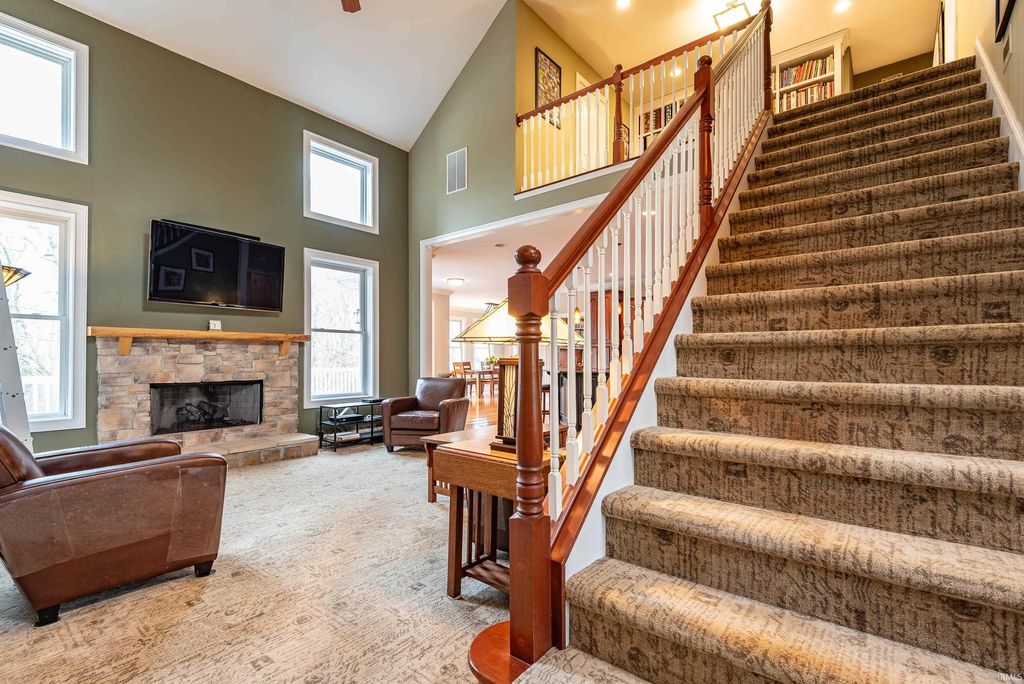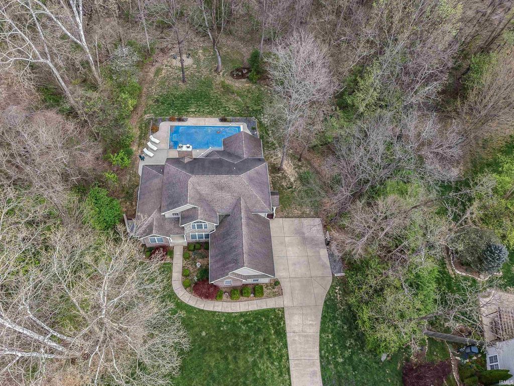 Wander this beautiful park-like property! This Fabulous home offers exceptional space, thoughtful design, and outstanding amenities throughout. This 4-5 bedroom residence features an open floor plan enhanced by crown molding and a stunning vaulted Great Room that flows seamlessly into a beautifully appointed kitchen with custom Amish cabinetry and abundant storage. The Main floor Office has adjacent bathroom and could be a convenient first floor 5th bedroom. An extra-wide staircase leads to the upper level, where you'll find generously sized bedrooms and a loft overlooking the Great Room. The main level also includes a spacious dining room with a tray ceiling, (currently used as a second office space), a primary suite with en-suite bath, a sunroom filled with natural light, (currently used as a dining room), a versatile office or additional bedroom, and a well-equipped laundry room attached to the mud room, with custom cabinetry. This home also has a convenient tankless water heater. The lower level is designed for both comfort and entertaining, featuring a large great room with a wood-burning fireplace and kitchenette, an expansive game room, exercise space, and an additional bedroom. Step outside to enjoy the inground heated pool, with a conveniently located full bath just inside for easy access. There is even a catio on the lower level! Situated on a premium lot backing to a 5-acre protected greenspace, close to IU and I-69, this property offers privacy and scenic views that will remain undisturbed. A rare opportunity combining space, function, and lifestyle.